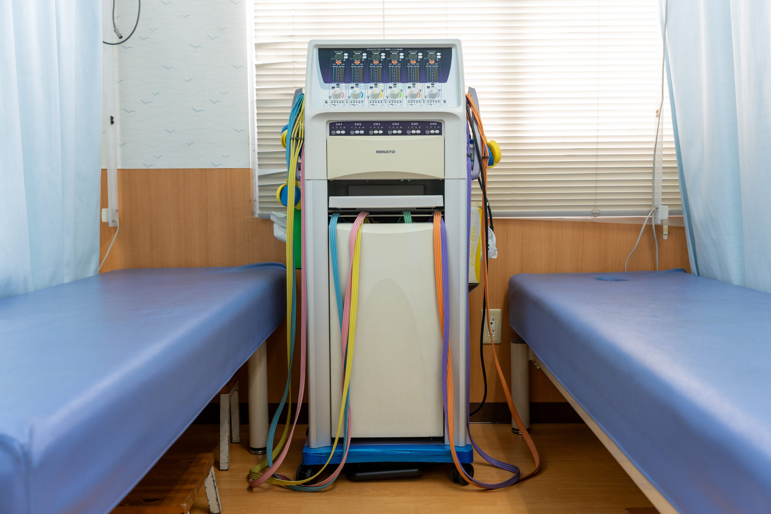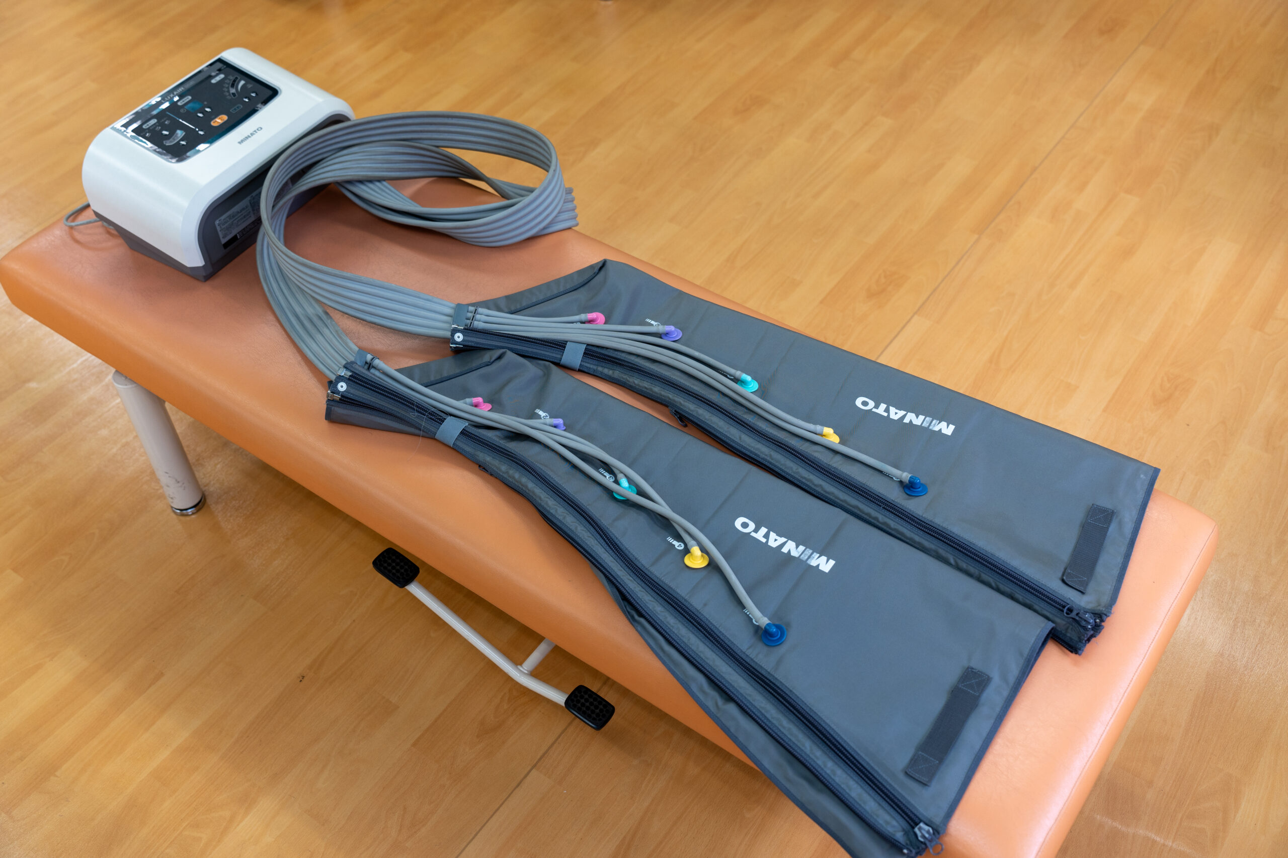 循環器の改善を行う治療機です。空気圧を利用して一定の圧力でマッサージし、脚にたまった血液・リンパ液および余分な水分を効果的に中枢に戻します。